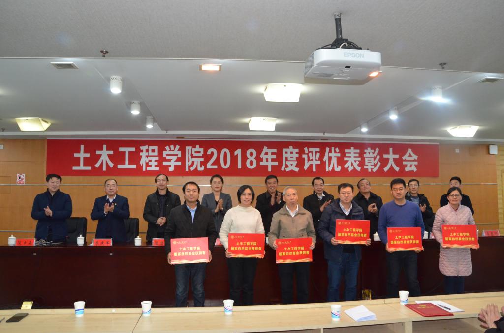土木学院党委书记李建军以大事记的方式,对2018年学院取得的重要成就进行了简要的回顾总结,副院长范夕森、李秀领,学院党委副书记王鹏分别宣读了学院教学工作和专业建设获奖人员名单、学院学科建设奖励名单、学院党群等工作获奖人员名单,对学院2018年度在教育教学、专业建设、学科建设、科学研究、党建工作、就业创业等方面涌现出来的先进典型进行了表彰。在热烈的掌声中,与会领导为获奖教师代表颁发证书。