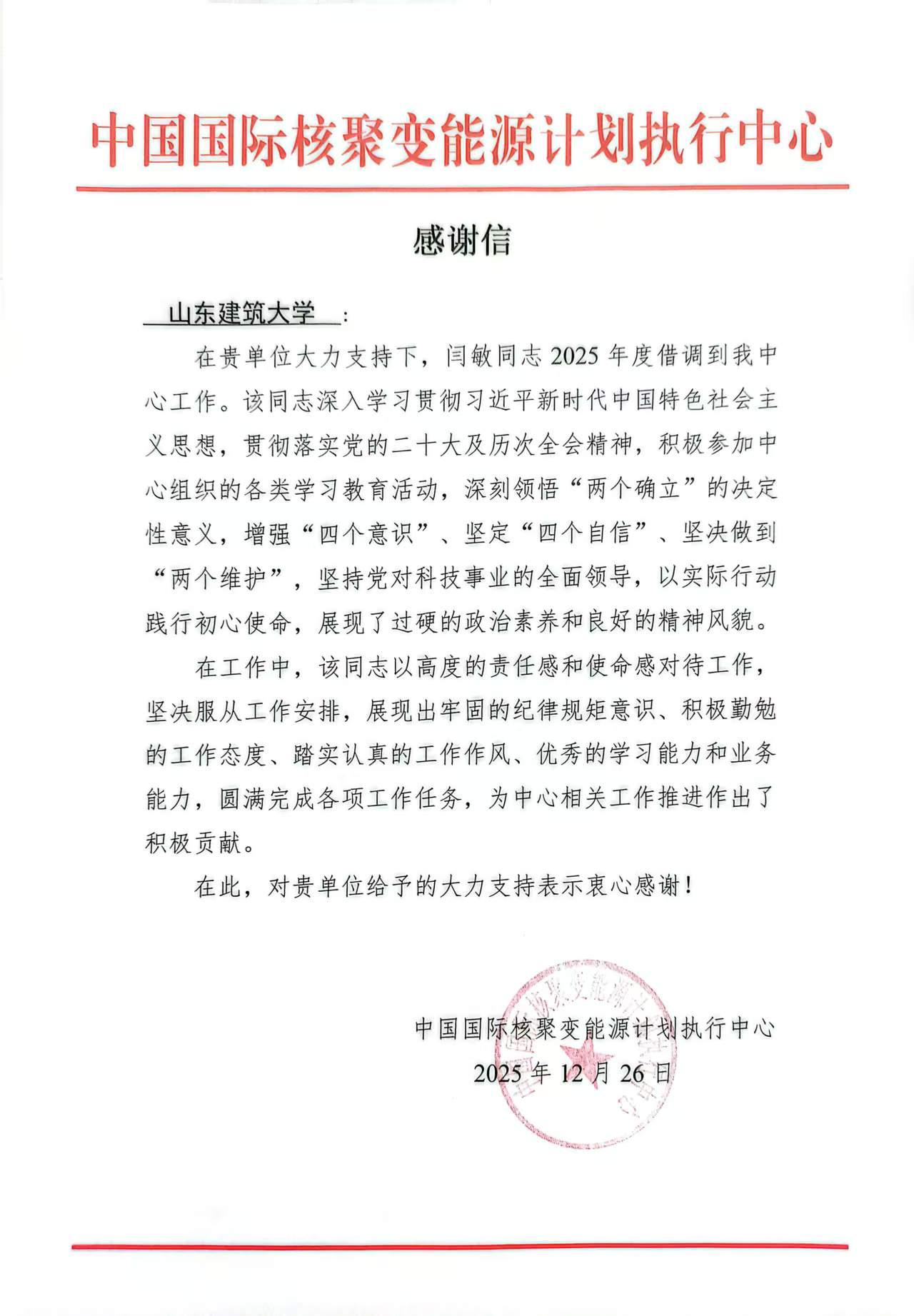 近日,我校收到科技部中国国际核聚变能源计划执行中心(核聚变中心)发来的感谢信,信中对我校借调至核聚变中心的热能工程学院教师闫敏的工作表现给予了高度评价,对学校给予的大力支持表示衷心感谢。