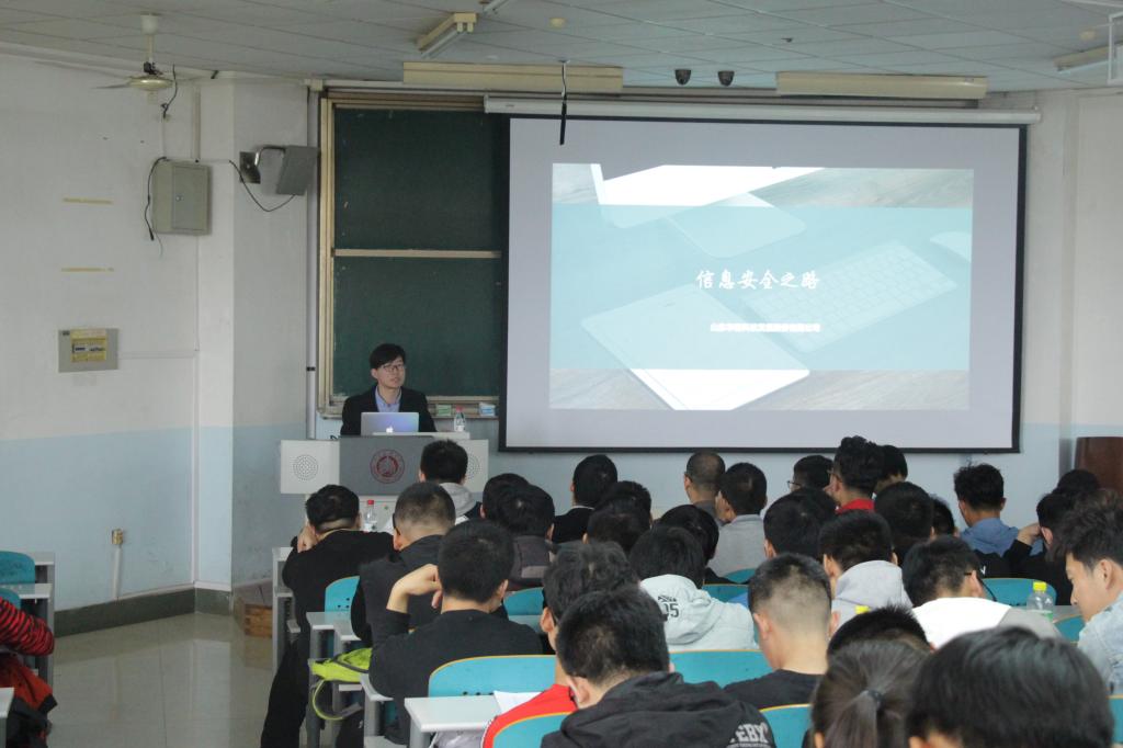 为了提高同学们的信息安全意识,充分了解网络安全知识,10月25日下午,由校团委主办、计算机科学与技术学院承办的第一百六十四期“创新创业大讲堂”——“信息安全之路”安全讲座在博文馆409教室成功举办。华鲁科技发展股份有限公司副总经理李建和HR单世腾,计算机学院部分同学参加讲座。山东华鲁科技发展股份有限公司信息安全中心负责人张海峰先生担任主讲,讲座由史善力同学主持。