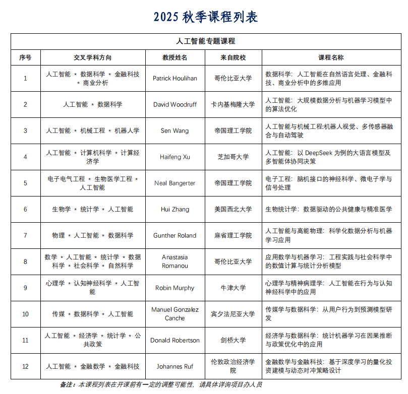 为进一步落实学校党代会提出的“一三九”战略和《山东建筑大学人工智能赋能教育教学工作实施方案(试行)》,进一步推进交叉学科前沿研究和协同攻关,拓展师生国际视野,提升我校师生跨学科研究能力和“人工智能+”数字素养,满足我校师生利用国际顶尖大学教育资源来拓展前沿学科知识、提升科研能力的需求,我校拟于2025年秋季学期联合中国教育国际交流协会开展“国际化拔尖创新人才培养计划——跨学科交叉前沿‘人工智能+’专题课程”试点选课工作。有关事宜通知如下。