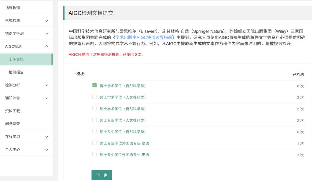 登录账号后,点击网页左侧“AIGC检测”菜单下的“上传文档”,选择对应的模板后上传论文、查看检测结果即可(见图1)。