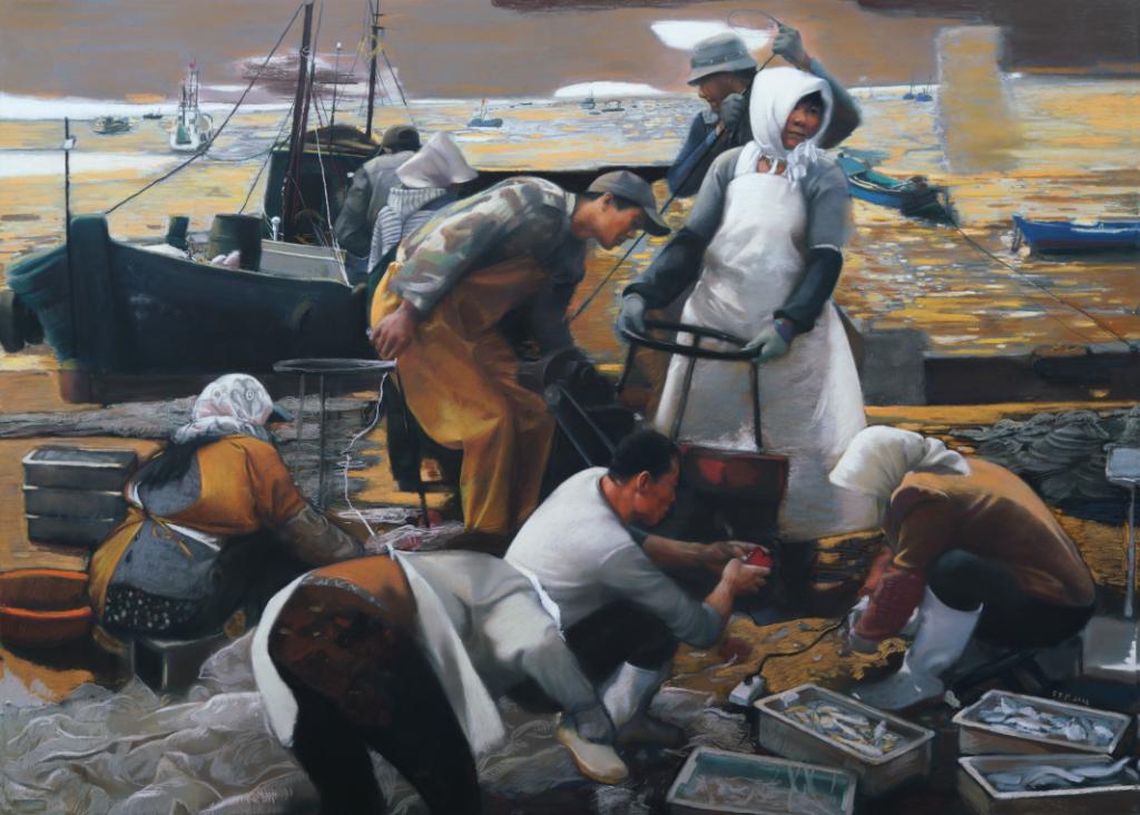 色粉画《海洋牧场》,是运用现实主义表现形式,描绘国家发改委、农业部、国家海洋局在全国沿海地区开展海洋牧场示范区的建设成就。作品通过横向构图,突出刻画牡蛎收获季节的劳动场景。整体构图中利用多条强化的水平线与渔民形象形成的垂直线,交织分割画面。又以弯腰的渔民形象为中心,形成放射性构图特点,突出宏大的劳动气氛。渔民、网笼及牡蛎形成了层层递进的倒三角形式,强化了画面的对外冲击力。