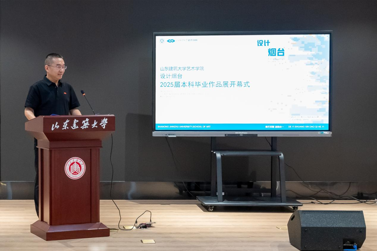 2025年6月6日上午9时,“设计烟台——山东建筑大学艺术学院2025届环境设计(中外合作办学)本科毕业作品展”开幕式在山东建筑大学烟台产学研基地隆重举行。校党委副书记黄晓广出席开幕式并致辞。学校相关职能部门、产教融合学院及艺术学院负责人、师生代表共同见证了这一艺术盛会。开幕式由艺术学院副院长王志远主持。
