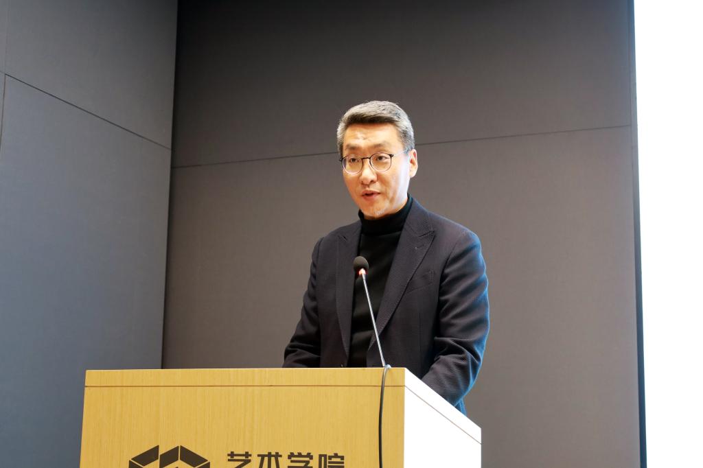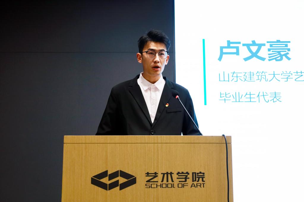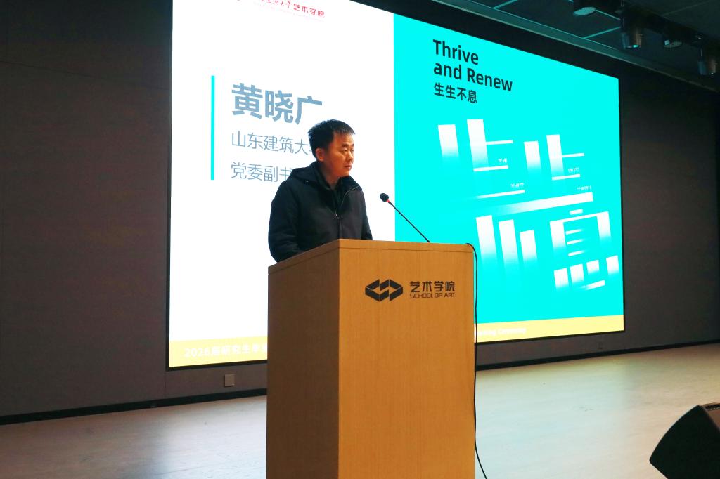 2025年12月23日上午,“生生不息——山东建筑大学艺术学院2026届研究生毕业作品展”开幕式在艺术学院美剧场隆重举行。党委副书记黄晓广出席开幕式并讲话。