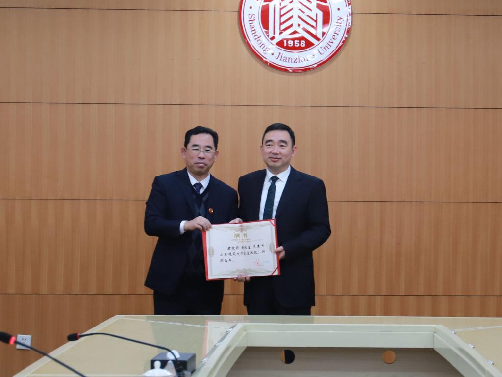 签约仪式上,靳奉祥校长与徐敏生总裁签署战略合作协议;陈飞勇院士与吴鹏社长共同为“山东建筑大学-大地国际技研株式会社共建研发基地”揭牌;靳奉祥校长为徐敏生总裁颁发山东建筑大学客座教授证书。